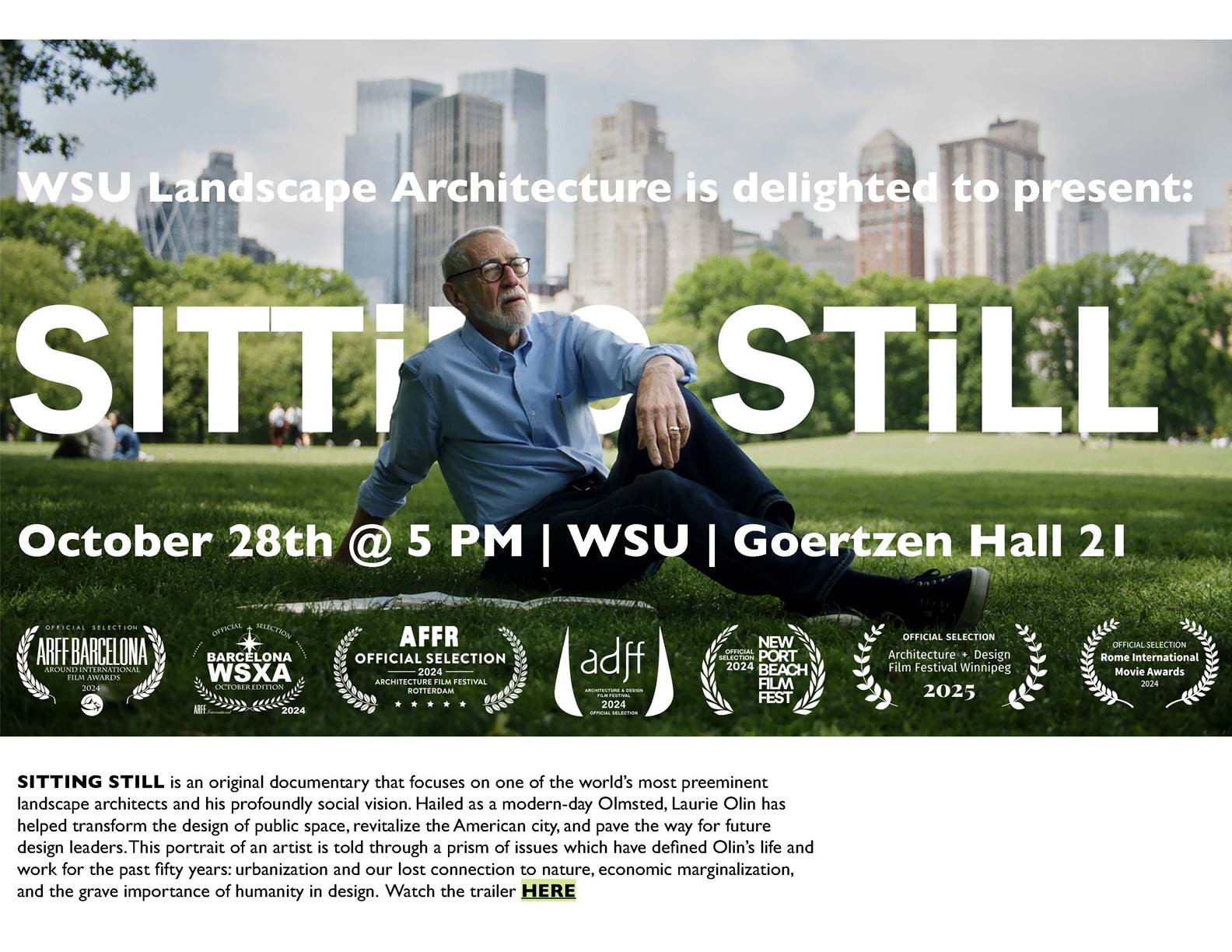 ![]() Film Screening at WSU SITTING STILL: a 90-minute documentary film Directed, Produced & Written by Gina M. Angelone Featuring Laurie Olin WSU Landscape Architecture will be hosting a film screening on Tuesday, October 28th, 5:00 pm in Goertzen Hall 21. This event is FREE and open to the public! No RSVP required. SITTING STILL is an original documentary that focuses on one of the world’s most preeminent landscape architects and his profoundly social vision. Hailed as a modern-day Olmsted, Laurie Olin has helped transform the design of public space, revitalize the American city, and pave the way for future design leaders. This portrait of an artist is told through a prism of issues which have defined Olin’s life and work for the past fifty years: urbanization and our lost connection to nature, economic marginalization, and the grave importance of humanity in design. SITTING STILL gets inside the mind of a prophetic and visionary urban designer to see what he sees. In a time when global values increasingly reflect “profit over people,” Olin's vision has always been to create a more democratic and egalitarian society through healthy, shared public space. SITTING STILL invites the voices of other design luminaries into the conversation, including preeminent architects Frank Gehry and Billie Tsien, and esteemed landscape designer and artist, Walter Hood, among others. According to these global thinkers and designers, environmental and human stakes have never been higher, and the most pressing challenges of the natural environment and social disunity can be addressed in how we think about the marks we make upon the land. Watch the trailer here: https://youtu.be/pdAn70Kznjc?si=anlMbJVJ04FNyOHc |